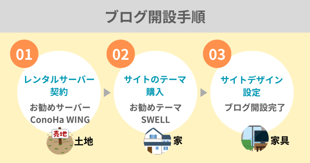 土地(レンタルサーバー)、家(サイトテーマ)、家具(デザイン)が必ず必要になります。